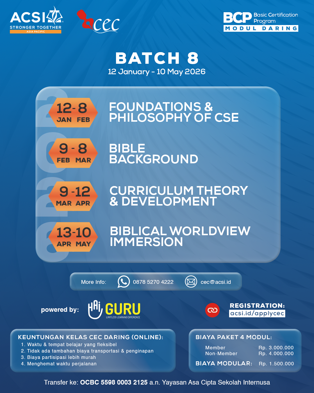 Sampai saat ini, kami terus mengusahakan agar sertifikasi ACSI bisa diakui oleh pemerintah Indonesia. Kendati demikian, sertifikasi ACSI bisa menjadi nilai tambah ketika Anda melayani di sekolah Kristen yang terakreditasi ACSI baik di Indonesia dan di dunia.